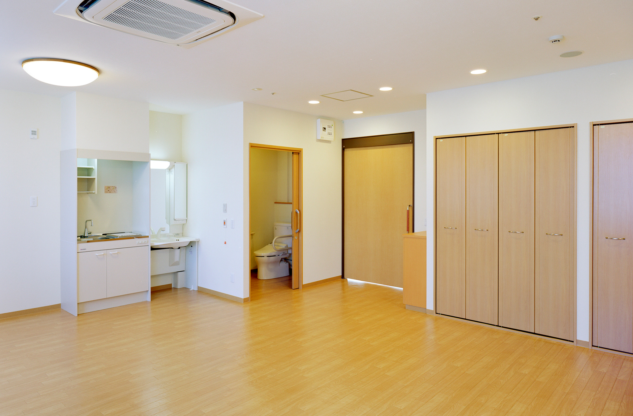 快適のための工夫が細部にまでこらされた居室スペース。 各居室内にはミニキッチン・トイレ・洗面・エアコン・クローゼットが設置され、ケーブルテレビ・インターネットにも接続できるので、プライベートな時間も快適にお過ごしいただけます。また電話も各室に設置可能なので、いつでも家族とのコミュニケーションをはかることもできます。